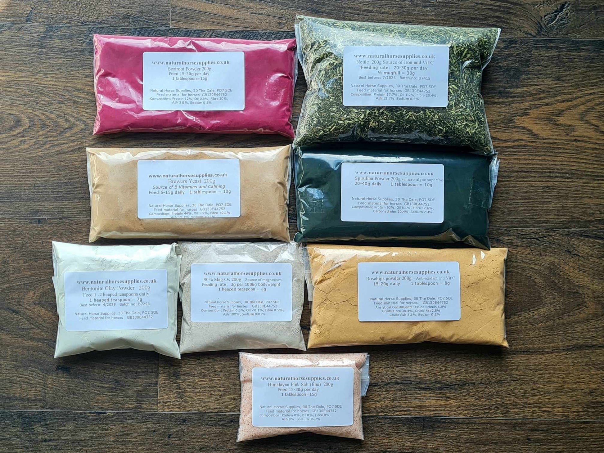A selection of 8 x 200g packs of herbs and supplements to add to buckets/tubs of water as a water buffet.