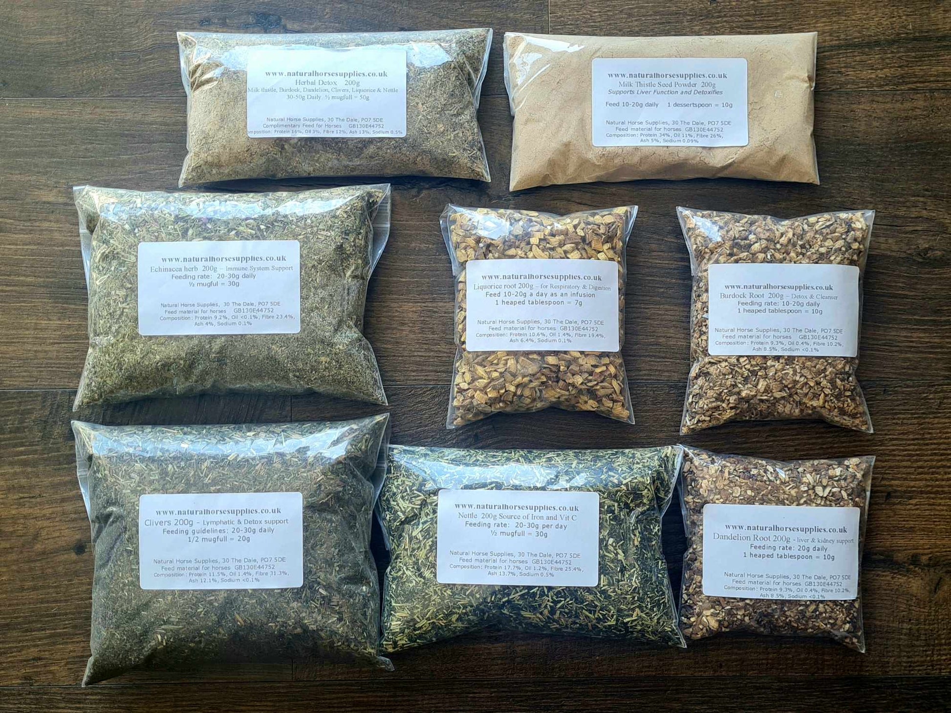 A selection of 8 x 200g packs of herbs and supplements to add to buckets/tubs of water as a water buffet.