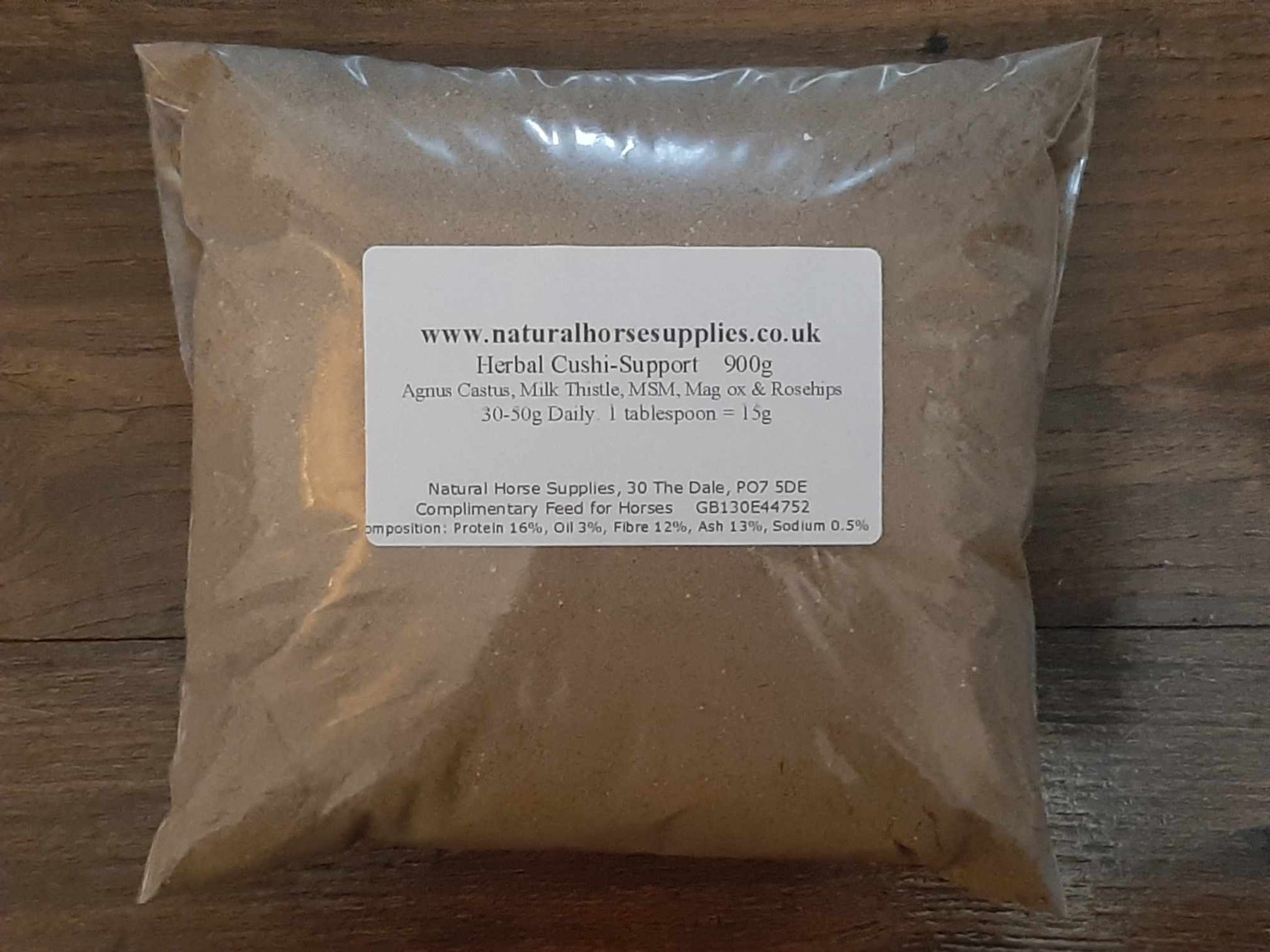Herbal Cushi-Support is an equal blend of agnus castus powder, milk thistle seed powder, MSM, magnesium oxide and rosehips powder.