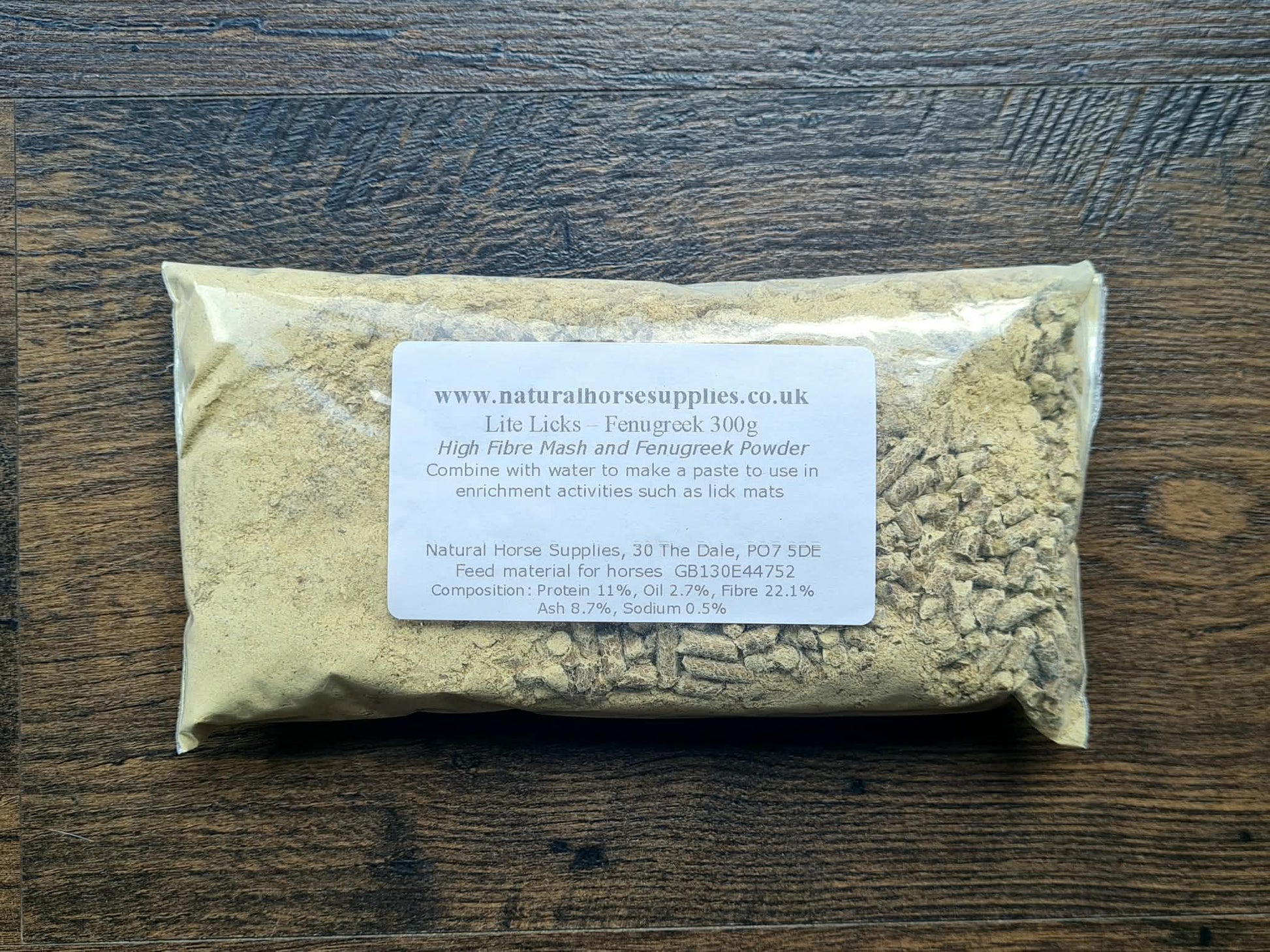 Our Lite Licks Fenugreek pack contains 225g of high fibre mash pellets and 75g fenugreek powder. Just mix with water to make a paste, 400ml of warm water added to 100g of the blend makes a thick paste, more can be added to suit. Then apply to your chosen lick mat and place in your horse's feed bowl or directly on the floor.