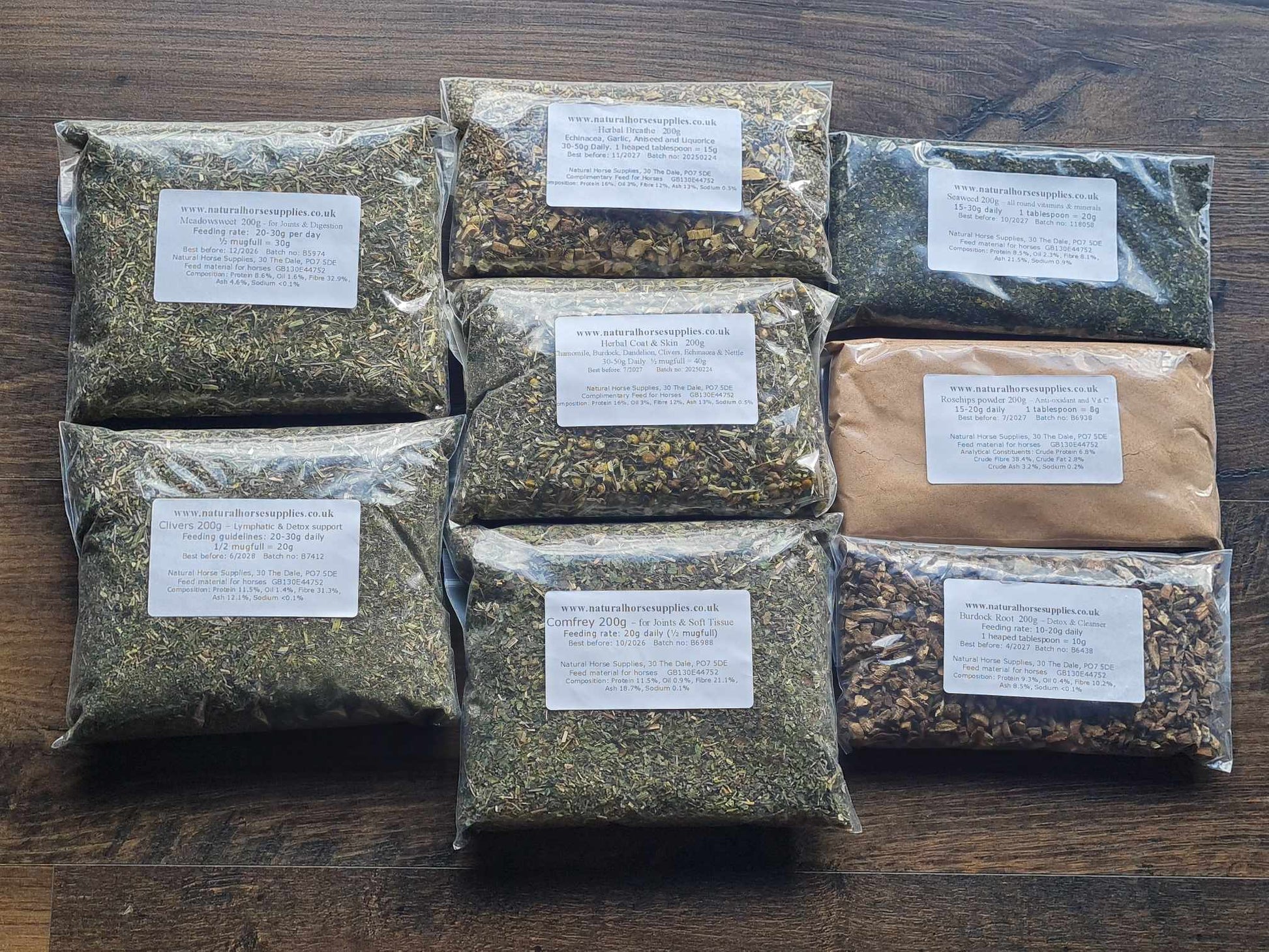 A selection of 8 x 200g packs of herbs and supplements to add to buckets/tubs of water as a water buffet.